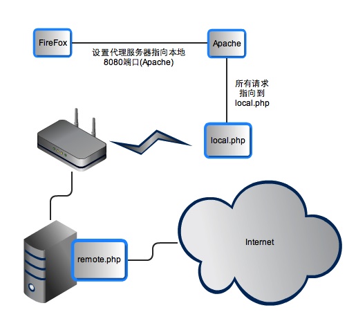 通过firefox发送http请求到本地的apache端口,apache收到请求后交给local.php脚本处理。 local.php脚本把firefox发过来的http头信息封装发送到远程服务器的remote.php。remote.php再解释local.php发过来的头信息,得到要访问那个服务器。然后去目标服务器取数据,按原路返回。