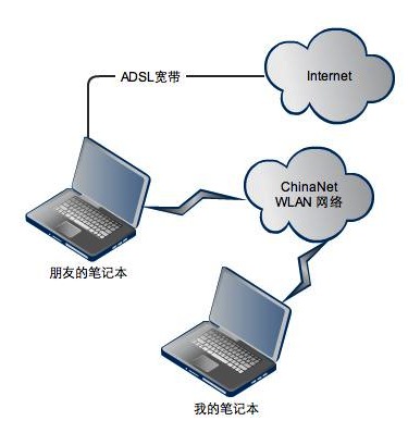 朋友通过有线网卡接入互联网,然后无线网卡连接wlan。然后将有线网卡的网络共享打开,共享网络给无线网卡。无线网卡设置IP地址:192.168.0.1,子网掩码:255.255.255.0,网关:192.168.0.1。 我的电脑连接到wlan之后,设置无线网卡的IP:192.168.0.2 , 掩码:255.255.255.0,网关:192.168.0.1。 这样我就可以上网啦~~~